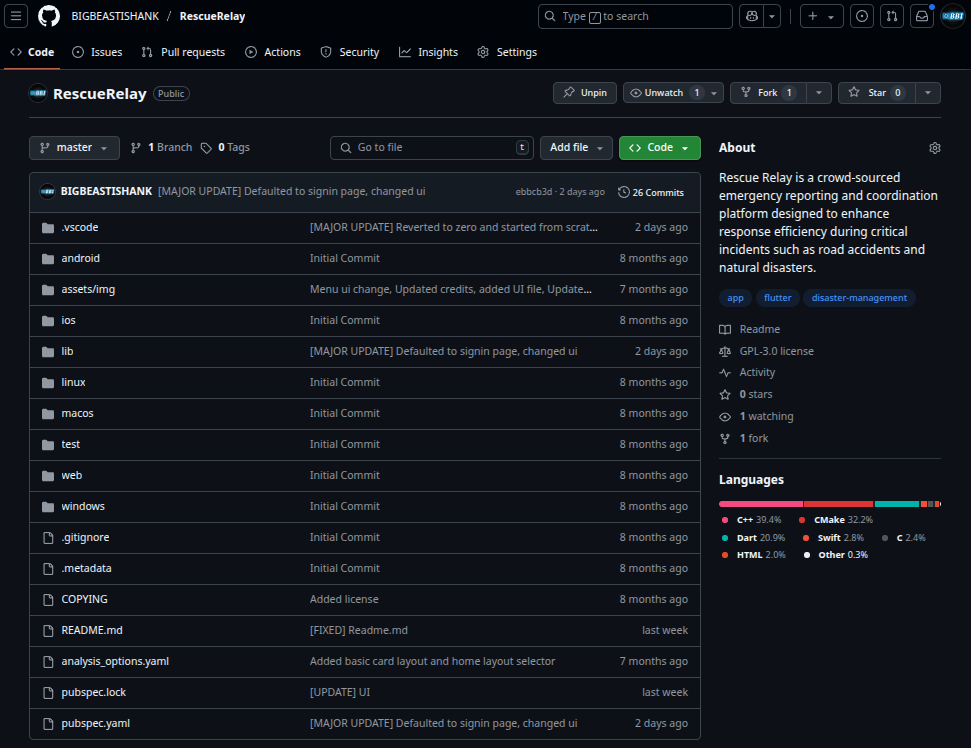 Rescue Relay was an app idea which I, with my friends at Manipal University Jaipur, have discussed. It would be a disaster management platform which would help many people. This idea first came into existence at MUJ HackX 2.0, in which I had participated with my colleague. After that the idea kind of died in the dark, but the concept came back after our classes started in semester 1. There was a subject of Creativity & Innovation. In that class we need to come up with some project idea. I changed the idea a little bit and presented it with the new team (all people links will be given at the end). Many students in that CAI team were there just for marks, but I decided to make it an app. I tried working on it, but I don't have much motivation to do android development & due to some technical issue (Arch Linux Flutter package corruption), I left working on the app. I started working on the app after almost 6 and a half months. Now it's the time I am writing this blog, I don't want to work on the project. I don't want to explore a new domain, which is app development, I want to get deeper into stuff I already know. I am closing the development on the app, deleting it's codebase from my GitHub. The app idea is provided in the link to archive it for the future.